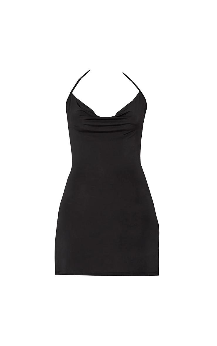 A little black dress is essential in every doll’s wardrobe, and we are loving this one. Featuring a black slinky material with a halter cowl neck design and a bodycon fit, we’re obsessed. Pair this with sandals for a chic finish.