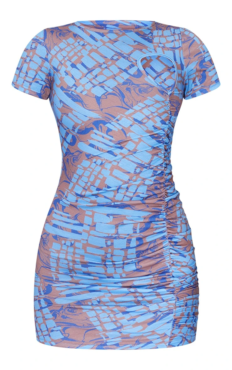 Add some new season print to your look with this dress. Featuring a blue marble print material with ruched detailing, short sleeves and a bodycon fit. We love this styled with heeled mules and a shoulder bag to get the look.