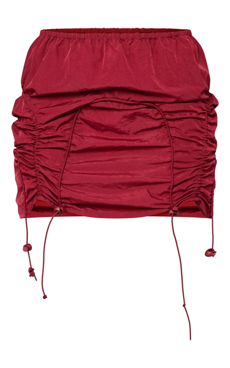 Say hello to your new season staple with this burgundy parachute toggle hem mini skirt. Brought to you in a burgundy parachute material with a toggle hem and a mini length, what more could you want? This mini skirt is here to banish any of your what to wear dilemmas doll. Style with a white bodysuit, high heel boots and faux leather jacker for a look that have you being the topic of everyone’s conversation.