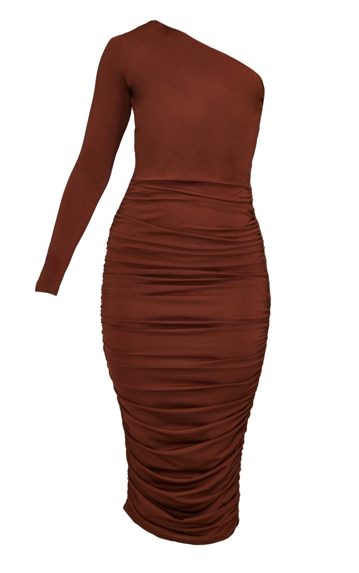 Your weekend look has finally been found with this mini dress. Featuring a chocolate slinky material with a one shoulder design, ruched detailing and a midi length, what’s not to love? Pair with high heels and gold accessories to complete the look.