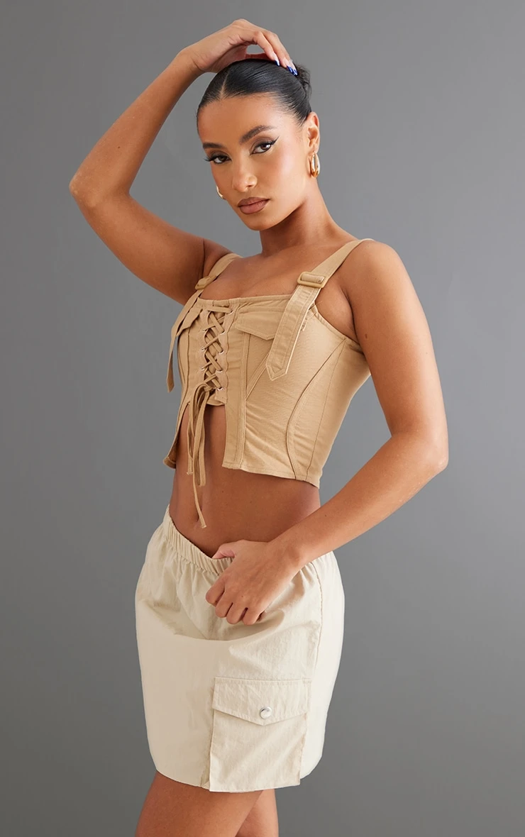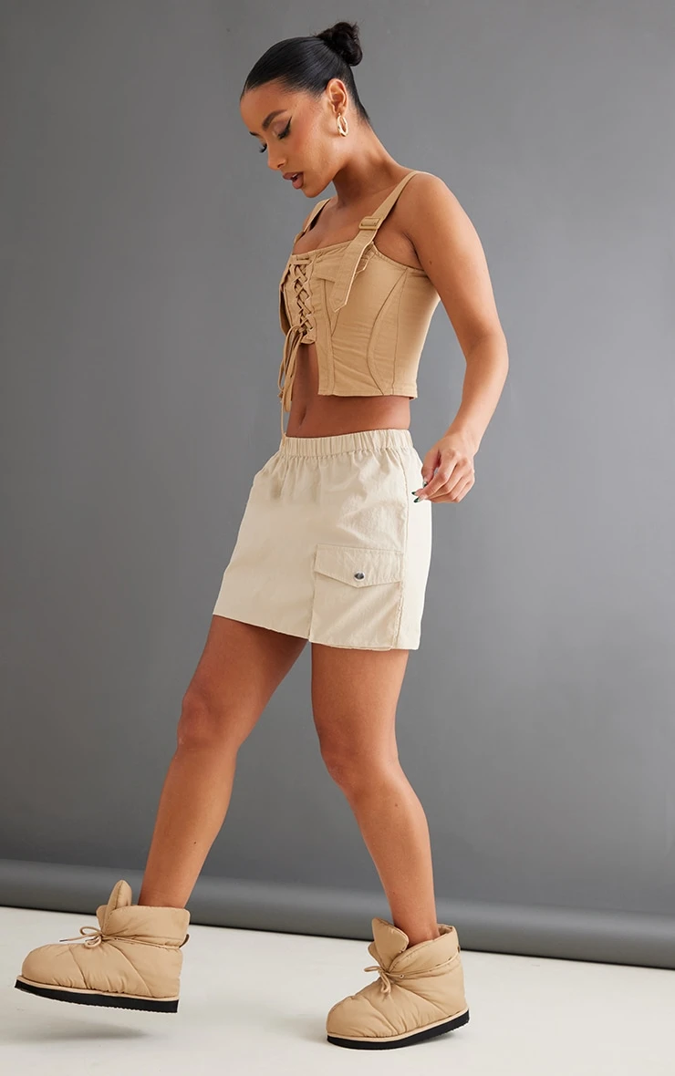 Add a little edge to your off-duty fit with this cream parachute pocket cargo mini skirt. This season is all about mini skirts and with a cream parachute material, cargo pocket detail, and an elasticated waist, how could you say no? Extend and expand your everyday wardrobe with something other than comfies by switching your outfit of the day for this mini skirt. Team this mini skirt with a lace-up crop top and comfy boots for a statement look that won’t go unnoticed.