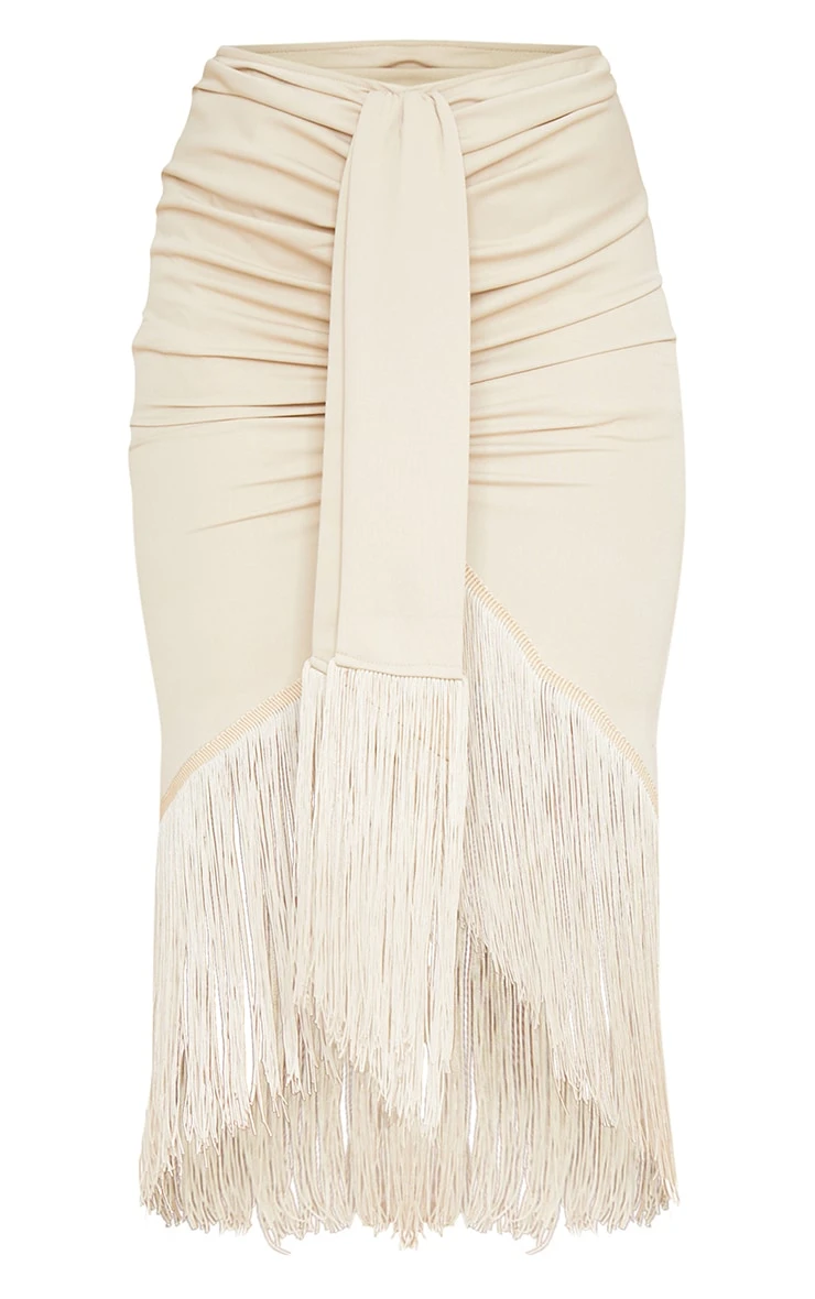 Earn some serious style points in this dreamy skirt doll. Featuring a cream material with a tassel hem design and a midi length, what’s not to love? Team with a white shirt, tie-up heels and a woven bag to make sure all eyes are on you.