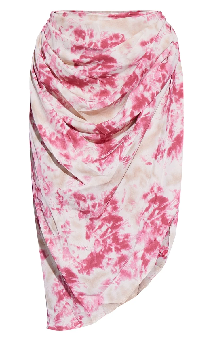 Steal all of the stares in this dreamy two piece set skirt. Featuring a fuchsia tie dye material with a ruched side and midi length, wear with the matching corset top and complete the look with high heels and statement accessories.