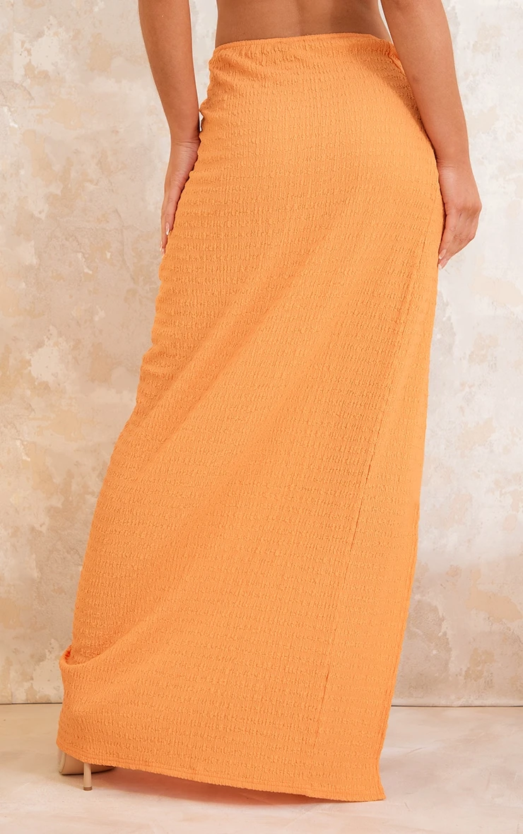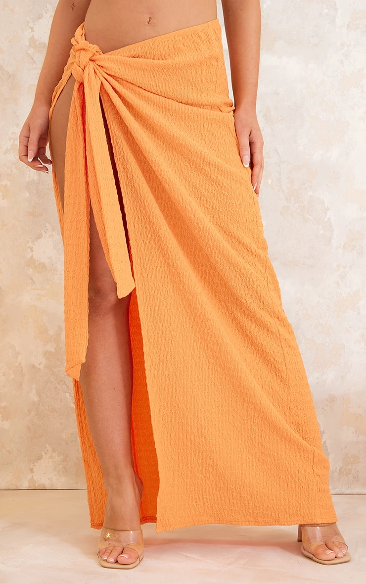 Step out in style this summer season with this hot orange textured jersey wrap knot side midaxi skirt. Made from a hot orange textured jersey material with a wrap design, knot side detail, and a split hem, you are sure to get everyone talking. Whether you’re shopping for an upcoming vacay or need a glam weekend ‘fit, then this midaxi skirt is just for you. Team this midaxi skirt with a dreamy blouse and clear heels for a look that won’t go unnoticed.