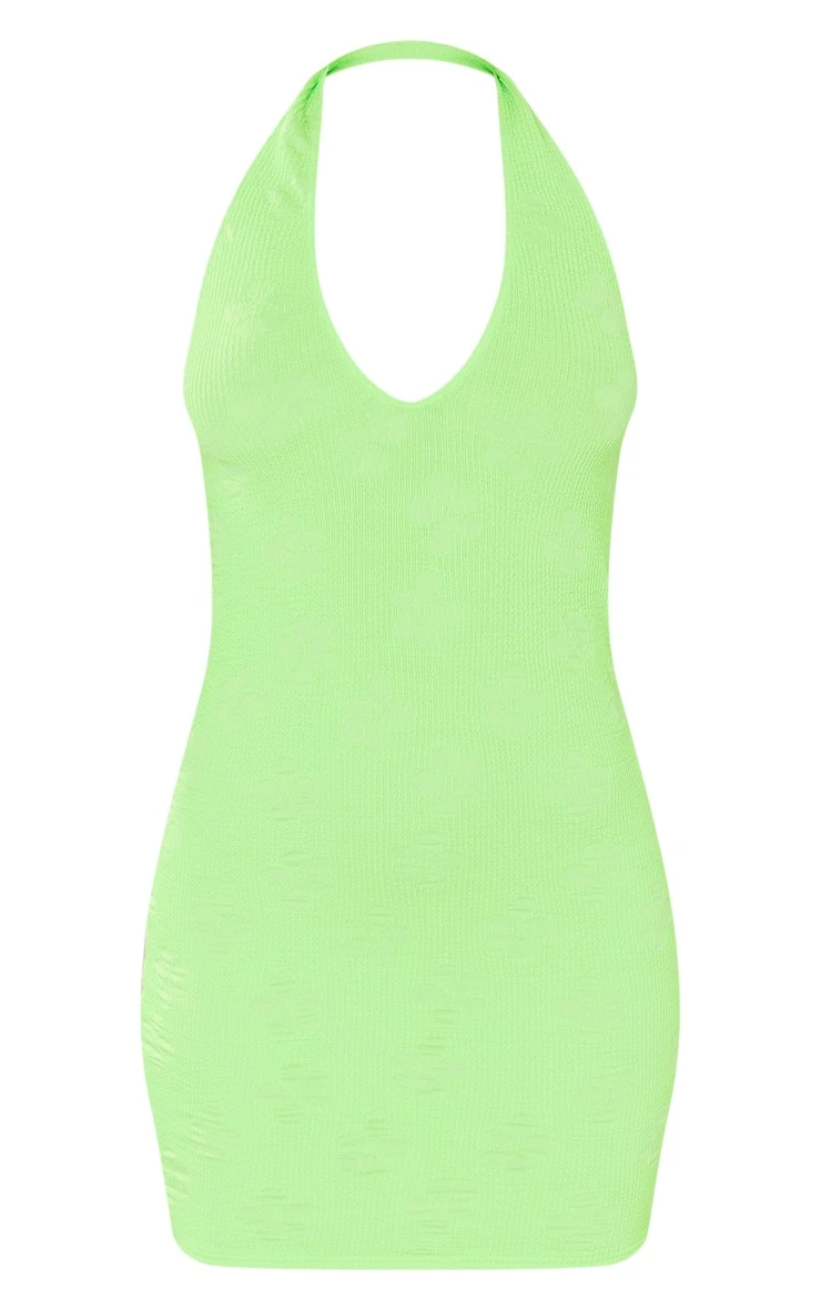 Stand out from the crowd with this lime crinkle flower detail halter bodycon dress and steal all the stares this weekend. With a lime crinkle material, flower detail, and a halter neckline, what more could you ask for? Whether you have a night full of dancing with the dolls planned or a vacay in the diary, this bodycon dress is a must-have. Team with clear heels and a mini bag for a look that is sure to impress.