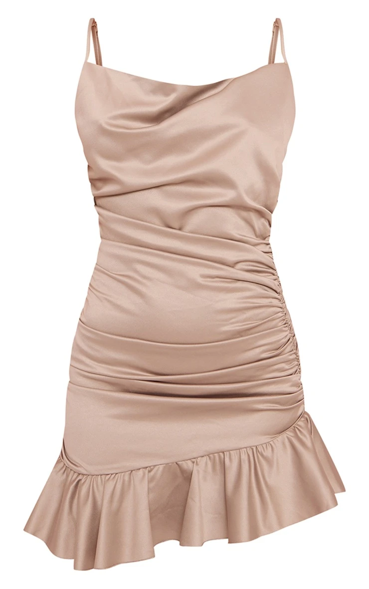 This mauve satin cowl ruched frill hem strappy bodycon dress is at the top of our new season wish list. With a mauve hue and a satin material, this dress is perfect for those important occasions you have pencilled in your diary. This dress has a satin material for those luxe vibes, and a ruched frill hem, what’s not to love? Style with some slip-on heels and some gold hoops to complete the look everyone is loving.