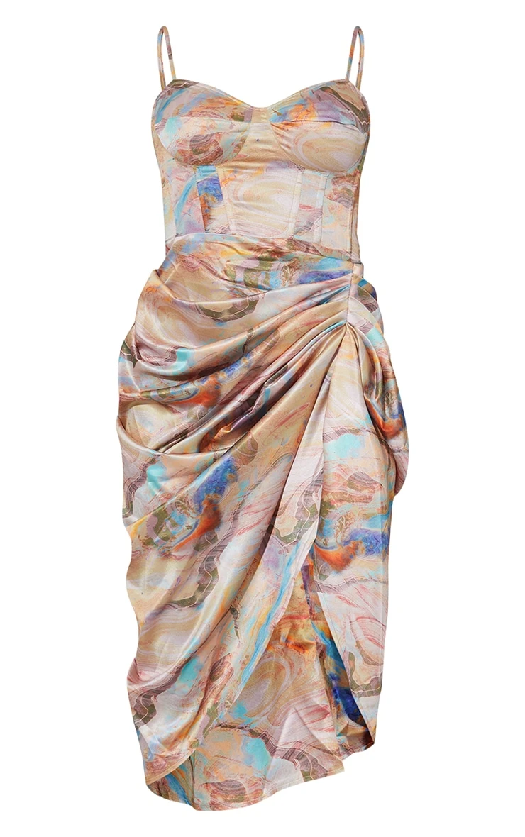 Get ready to have all eyes on you with this unreal dress doll. Featuring a multi hue marble print satin material with corset detail and a ruched midi skirt, we’re obsessed. Just add heels and gold hue accessories to complete the look for a dreamy vibe.