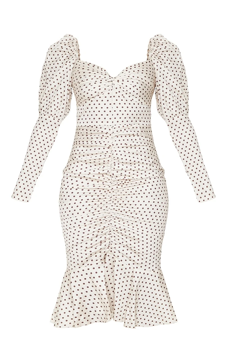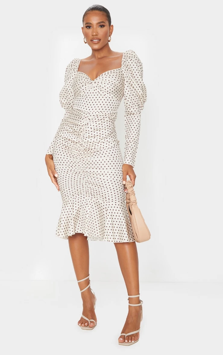This polka dot dress is sure to give your look a seriously chic update. Featuring a nude material with a black polka dot print, puff sleeves, a frill hem and a midi length, we are just obsessed. Perfect for styling up or down, this figure-flattering ruched dress in a midi style will have you looking and feeling confident no matter what the occasion. Style this with tie up heels and a mini bag for look that is sure to steal all the stares.