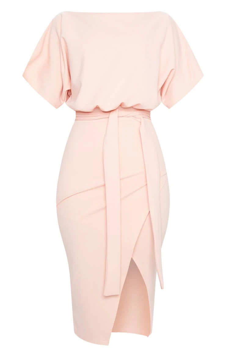 Channel feminine vibes with this midi dress doll. Featuring a nude material with a wrap front and kimono sleeves, wear this dress with strappy heels for a look that we are loving.