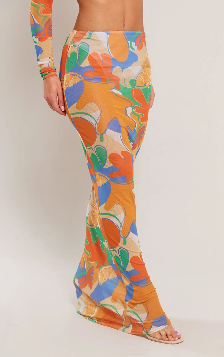 Your weekend outfit is finally sorted with this orange palm tree print mesh low rise midaxi skirt doll. Its orange palm tree printed mesh material is just what you need for the summer season and any upcoming vacays you might have. Its low-rise waist and midaxi length are seriously flattering and sure to earn you some compliments. Team with the matching top, sandals and gold accessories for a flawless finish.