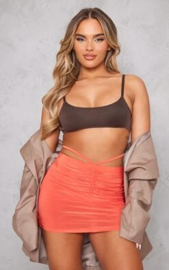 Say hello to your new season staple with this orange slinky ruched front tie waist micro mini skirt. Brought to you in an orange slinky hue with a ruched front, a tie waist and a micro mini length, what more could you want? This mini skirt is here to banish any of your what to wear dilemmas doll. Style with a brown bralet, jacket, and high heels for a look that have you being the topic of everyone’s conversation.