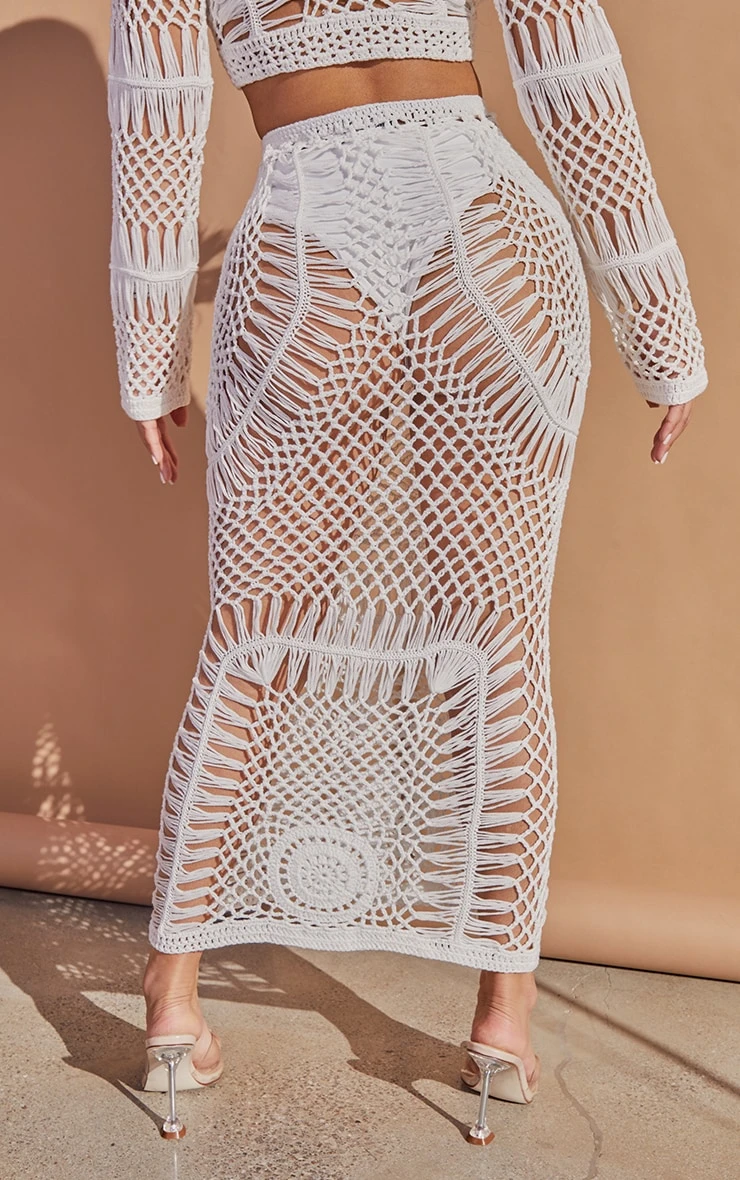 This midi skirt is sure to instantly elevate your look. Featuring a cream crochet material with a tie waist and a flattering fit. Team this with the matching top, heels and a matching set underneath to complete the look.