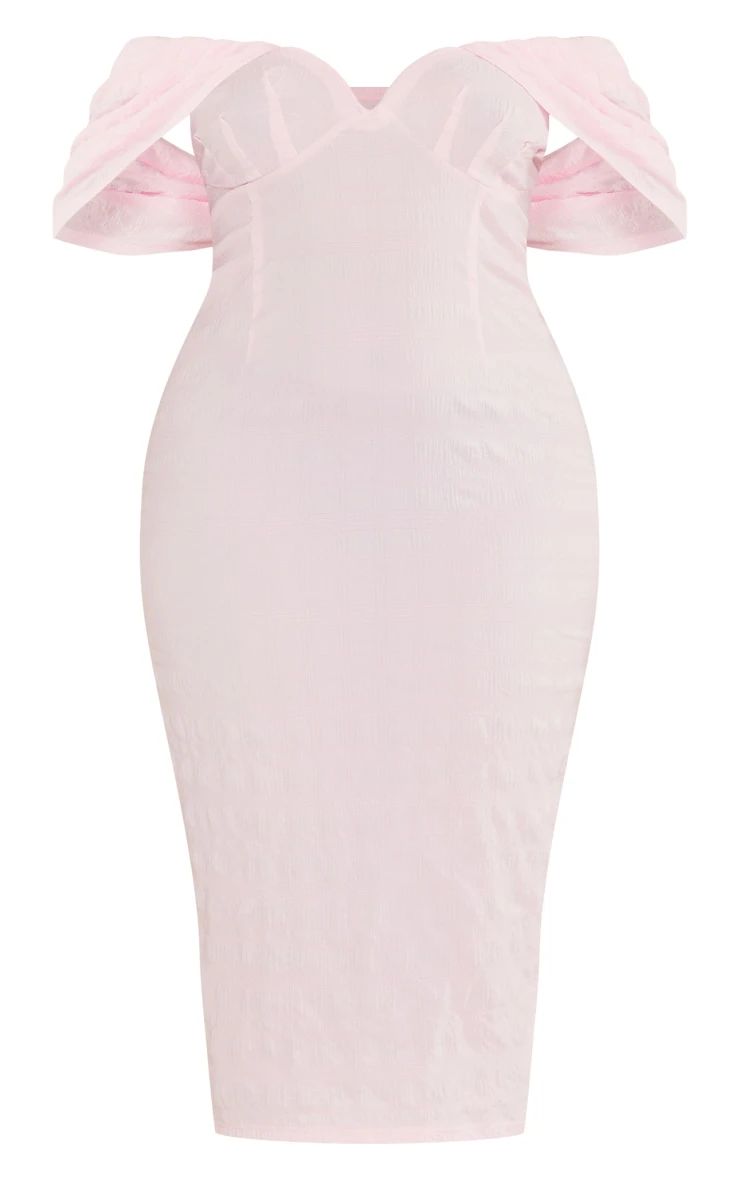 Channel all the glam vibes into your weekend look with this plus baby pink textured bardot mini dress. Its baby pink textured material gives you that super feminine touch and its bardot neckline with draped sleeves adds some dreamy feels to your look. This plus midi dress is the perfect piece for whatever you’ve got planned for the weekend. Simply add clear heels and gold accessories for a look that will get everyone talking.
