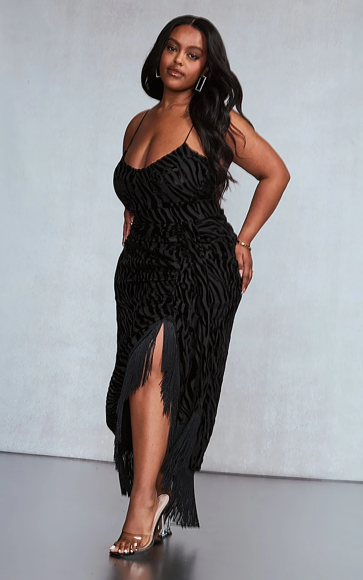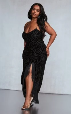 The weekend is here doll and this midi dress is perfect for whatever plans you have. Featuring a black devore material with a split hem and tassel detail. Style it with clear heels and your fave accessories for a night to remember.