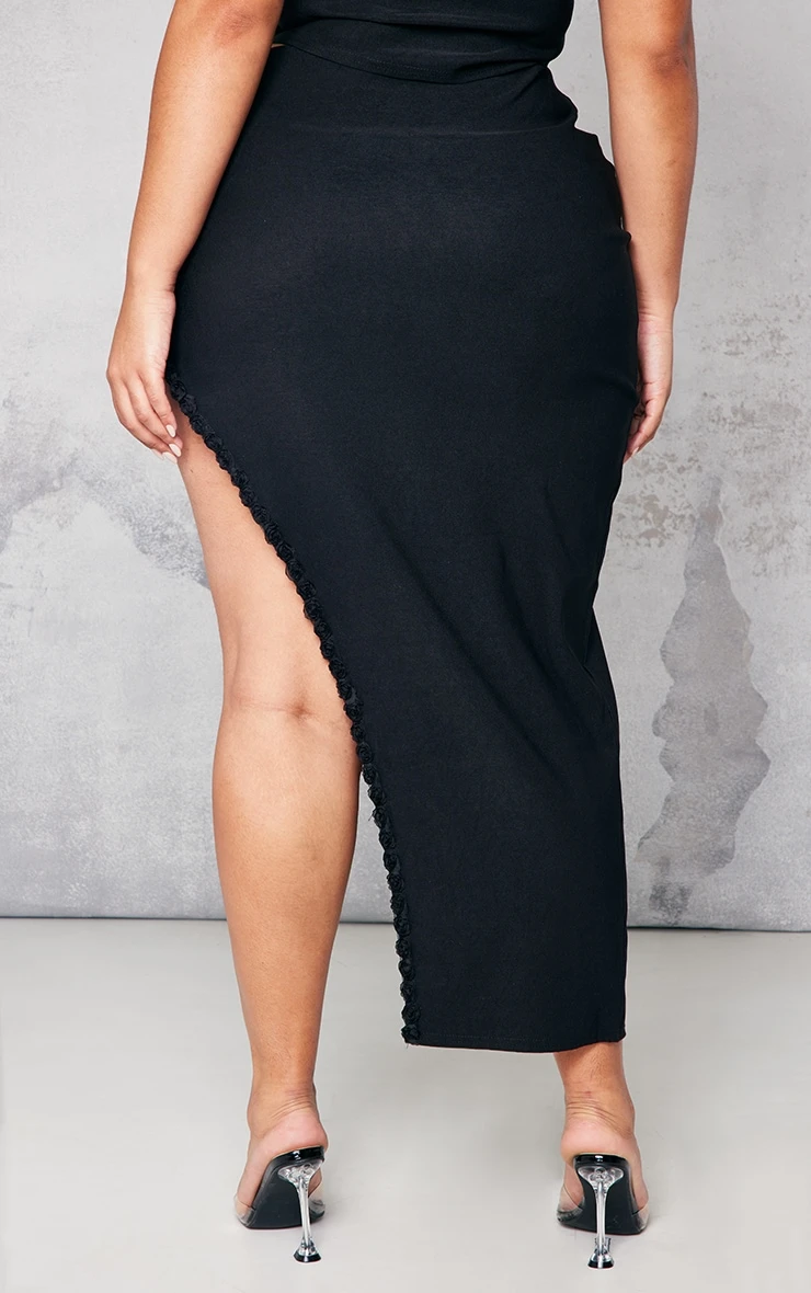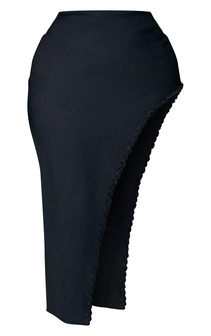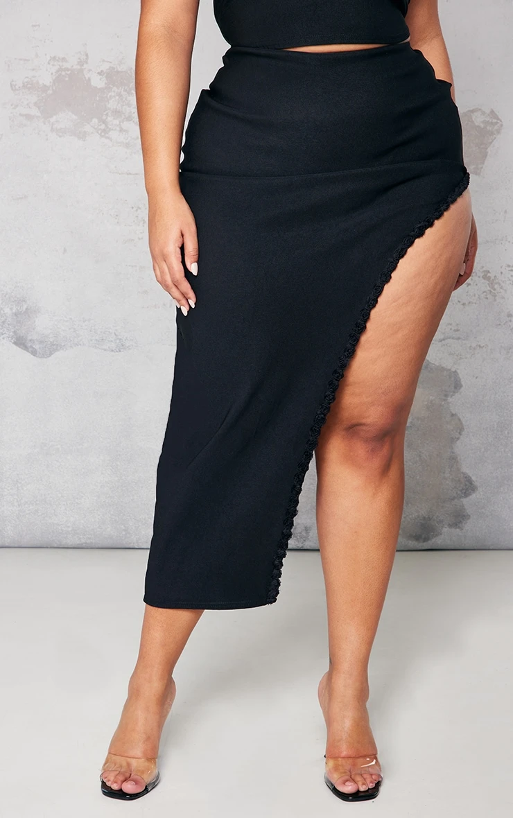 Take your weekend look to a new dimension with this skirt doll. Featuring a black material with a rose trim, an asymmetric hem and a midi length, we’re obsessed. Wear with the matching top, clear high heels and gold accessories to complete the look.