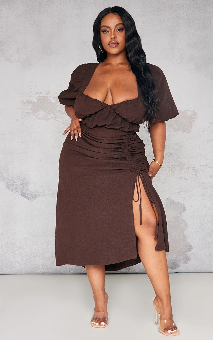This midi dress is sure to be at the top of your new season hit list. Featuring a chocolate material with a ruched side split design and puff sleeves. Wear with clear heels and hoop earrings for a luxe finish.