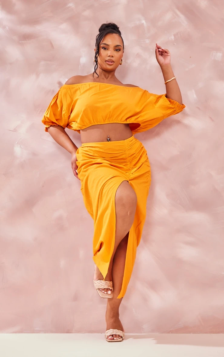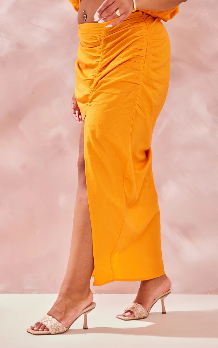 Your weekend outfit is finally sorted with this plus orange linen look ruched side split midi skirt. This skirt is brought to you in an orange linen look material for an effortlessly glam look we are obsessing over. With a ruched design and a side split detail, what more could you want? Team with some mule heels and some gold hoops to make a statement.