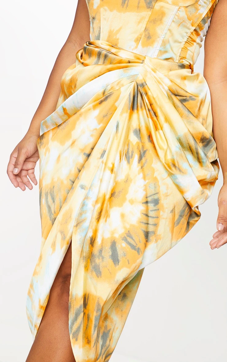 We are loving this midi skirt that’s sure to steal all the stares this season doll. Featuring an orange tie dye material with ruched sides, a midi length and thigh split. Team this with the matching top and complete the look with white mules and a micro bag.