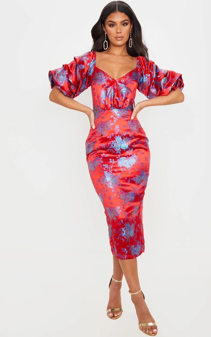 Add a touch of luxe into your weekend wardrobe with this floral dress, perfect for upcoming occasions and beyond. Featuring a red floral jacquard material with a lace-up back design, puff sleeves and a midi length, how could you resist? We’re all about back detailing this season doll and this one is sure to be at the top of your new season wish list. Simply team with your highest heels and statement earrings for a look we’re obsessing over.