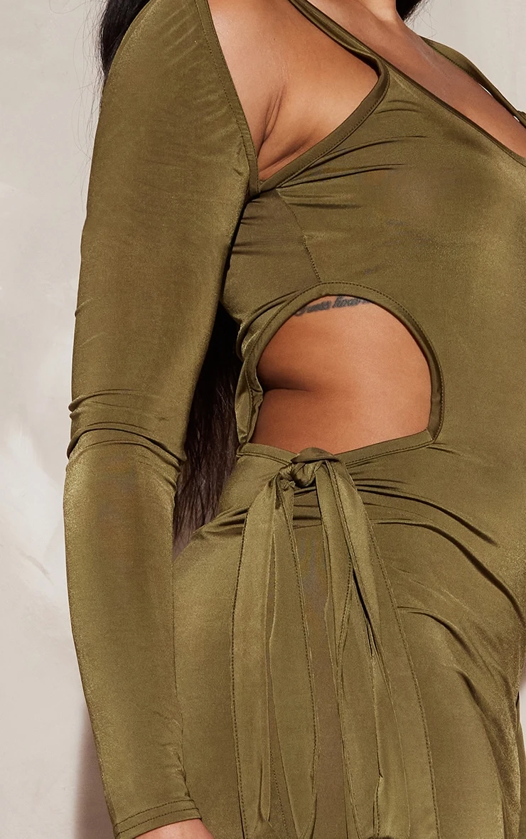 Take the stress out of weekend styling with this shape khaki slinky one shoulder strappy mini dress. Brought to you in a khaki hue slinky material and featuring a one shoulder design that’s bringing all the drama, what more could you ask for? Style this shape mini dress with clear strap heels and gold accessories for a fierce a weekend-worthy look that will make you the topic of everyone’s conversation doll.