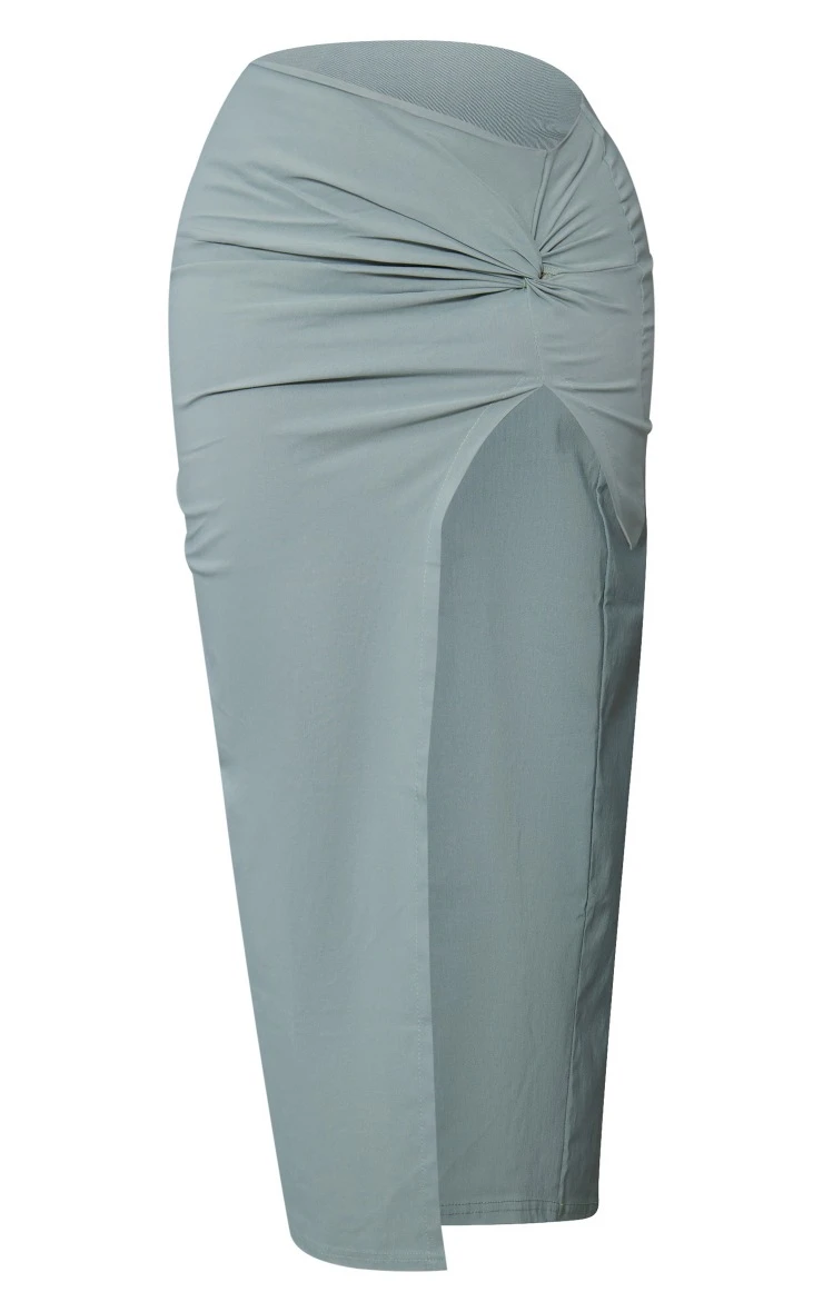 You’re sure to earn all the style points in this unreal skirt. Featuring a sage green stretch woven material with ruched detailing, a midi length and a split design, we are obsessed. Pair with the matching top and clear heels for a vibe like no other.