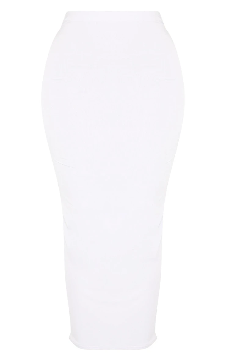 This white skirt is an ultimate staple for those of you who have an hourglass shape. Featuring a slinky fabric and midaxi length, style this with a mesh crop top and complete the look with high heels.