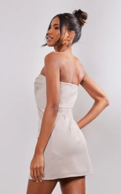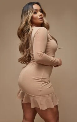 Shape Taupe Mesh Long Sleeve Ruched Side Frill Hem Bodycon Dress