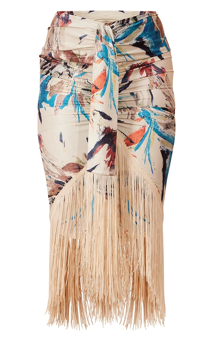 This midi skirt is sure to have all eyes on you. Featuring a stone material with a contrasting leaf print, a tassel hem design and a flattering fit, we are in love. Style with a crop top and strappy heels for a look that will get you noticed.