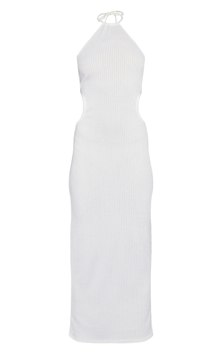 Say hello to this season’s newest must-have that can be styled for any occasion. This white textured rib halterneck cut out midaxi dress is the ultimate styling staple that can be worn on your upcoming vacay or even on your off-duty days. With a white textured rib material, a halter neckline, and cut-out detail, how could you say no? Style effortlessly with slides, gold accessories and a mini bag for a dreamy finish.